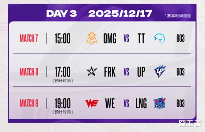 12月17日的比赛,LGD零封TT,OMG零封ZSM,LNG零封FRK。那么12月17日,在率先结束的第一场比赛中,OMG拒绝让一追二,战胜TT;那么,FRK和UP的比赛,谁又会笑到最后呢,让我们拭目以待。