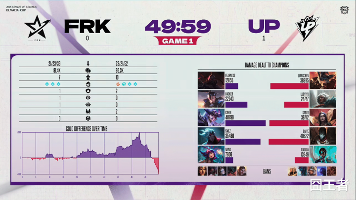 结果第一局比赛,UP上演了惊天逆转,在落后近5000的情况下,逆天改命,笑到最后。前40分钟,FRK打出了近5000的经济优势。40分钟左右,FRX拿下大龙,UP拿下小龙;41分钟左右,FRX攻破UP中路水晶;43分钟左右,UP在下路反击打出3换5;46分钟左右,龙魂团,UP拿下龙魂,后续UP打出2换4;最终49分59秒,UP攻入高地,团灭FRK后,顺利一波。