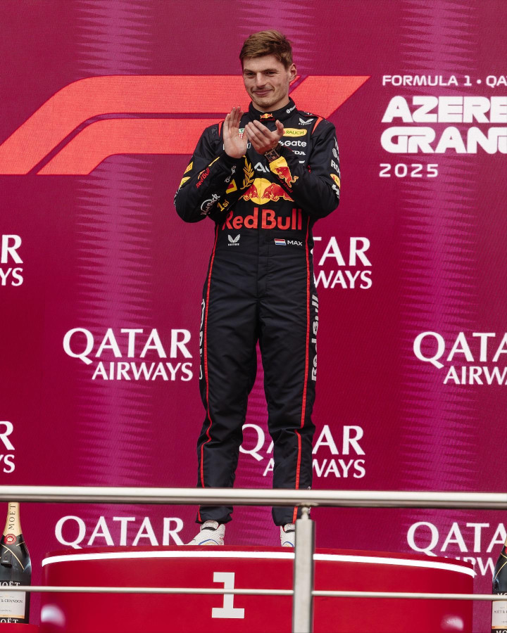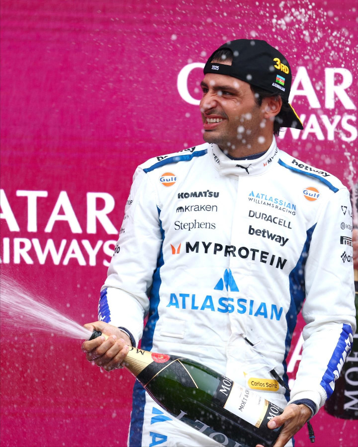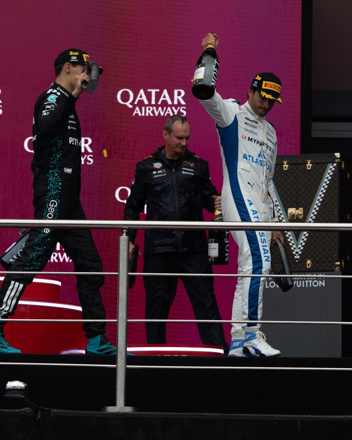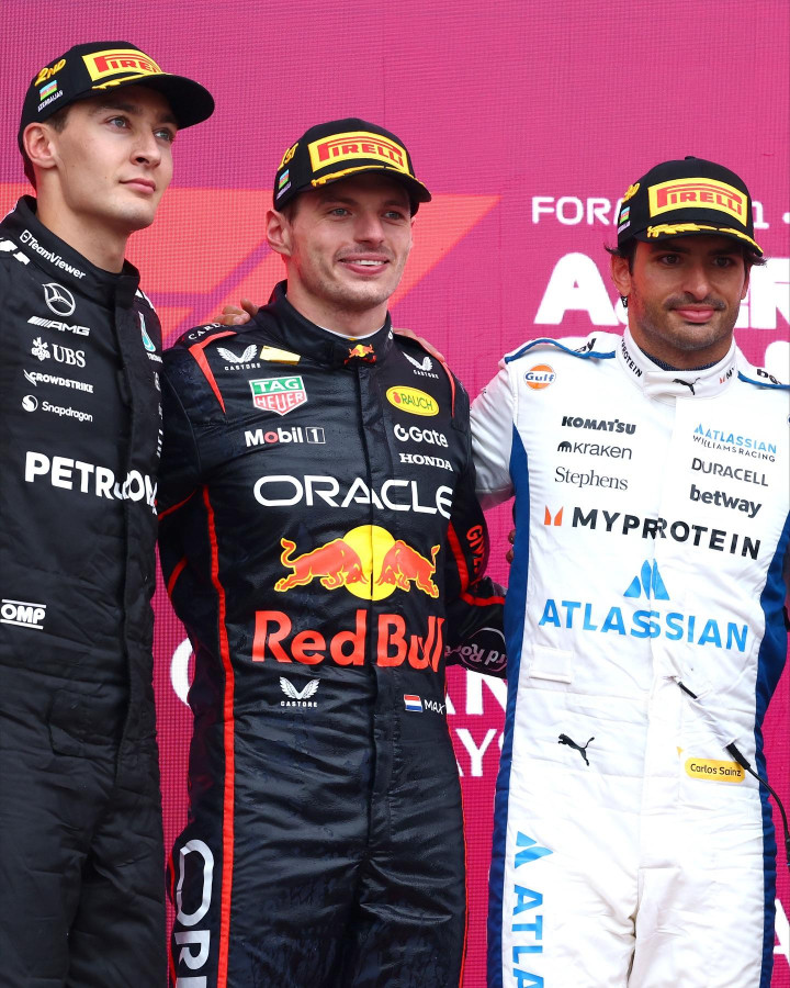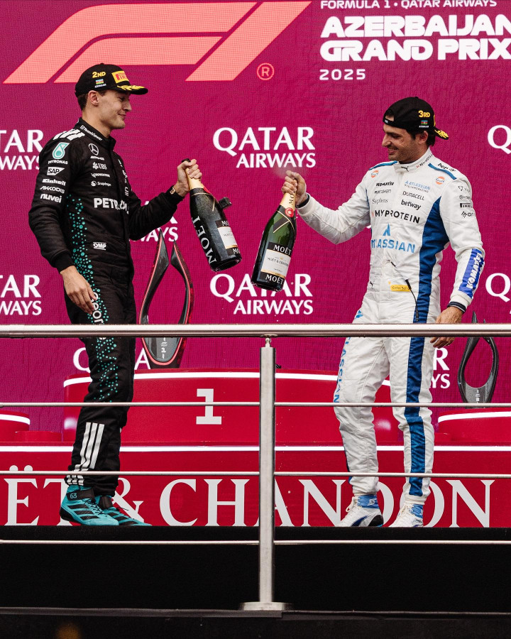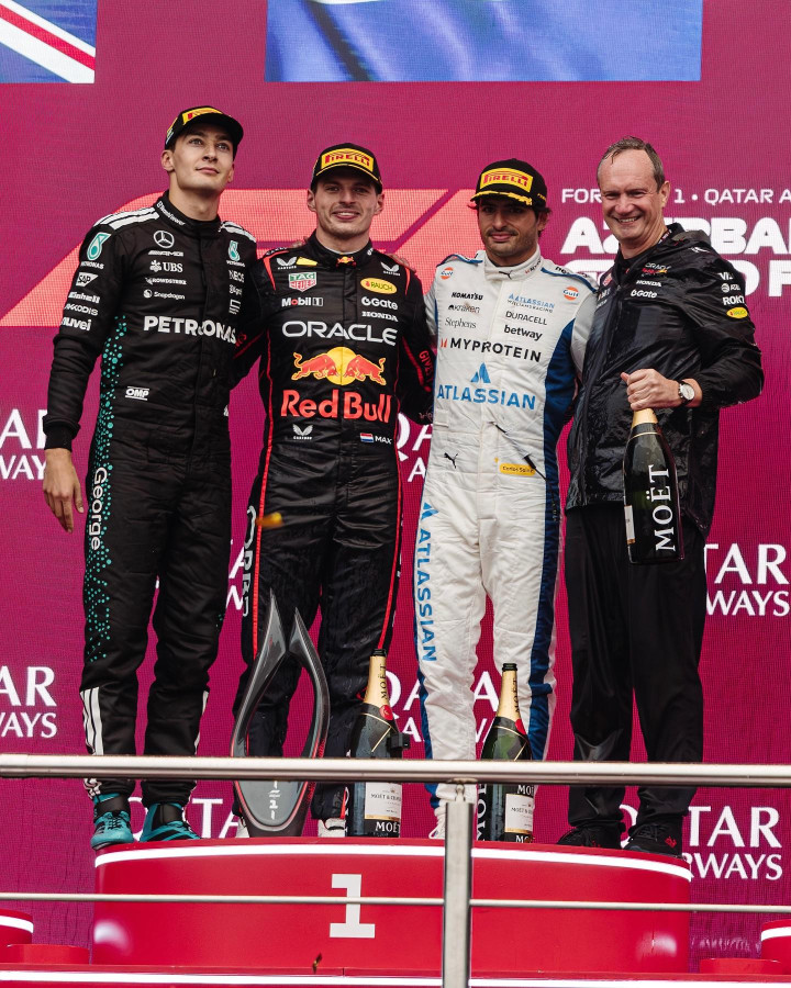 记者F1ins发推特报道,这个领奖台!我们见证了2025赛季又一个全新的前三名组合,场面令人激动#F1#Formula1#AzerbaijanGP@maxverstappen1@georgerussell63@carlossainz55