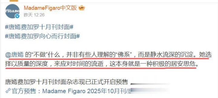 杂志官方还特意发文夸赞唐嫣,称她 “静水流深的沉淀,以质量的深度应对时间的流逝”,这样的高度评价,也能看出官方对她的满意程度。