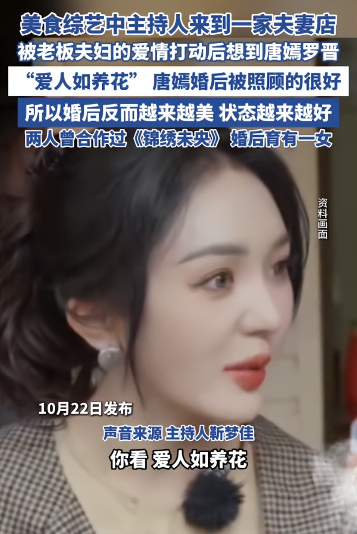 而事情的起因,是芒果台主持人靳梦佳,在节目里说到“爱人如养花”理论,说唐嫣就是婚后被照顾的很好,所以才越来越美。