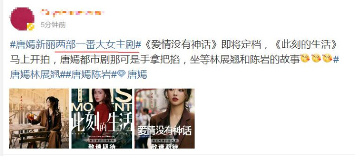 这边时尚资源亮眼,那边影视资源也传来好消息:唐嫣两部一番大女主剧有了新动态。