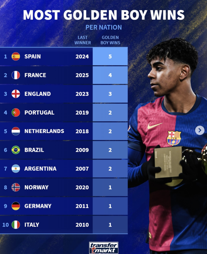 虎扑11月04日讯德转统计了金童奖得主国籍排行榜。