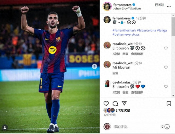 费兰-托雷斯赛后在社交媒体上晒出照片,庆祝取胜+打进2球,配文:“🦈+💧=⚽️⚽️”