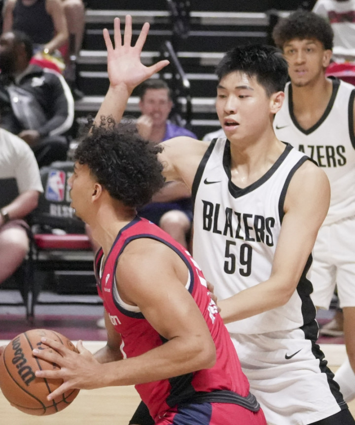 去年7月16日,NBA夏季联赛中,崔永熙(前右)代表波特兰开拓者队出战对阵华盛顿奇才队的比赛。新华社发